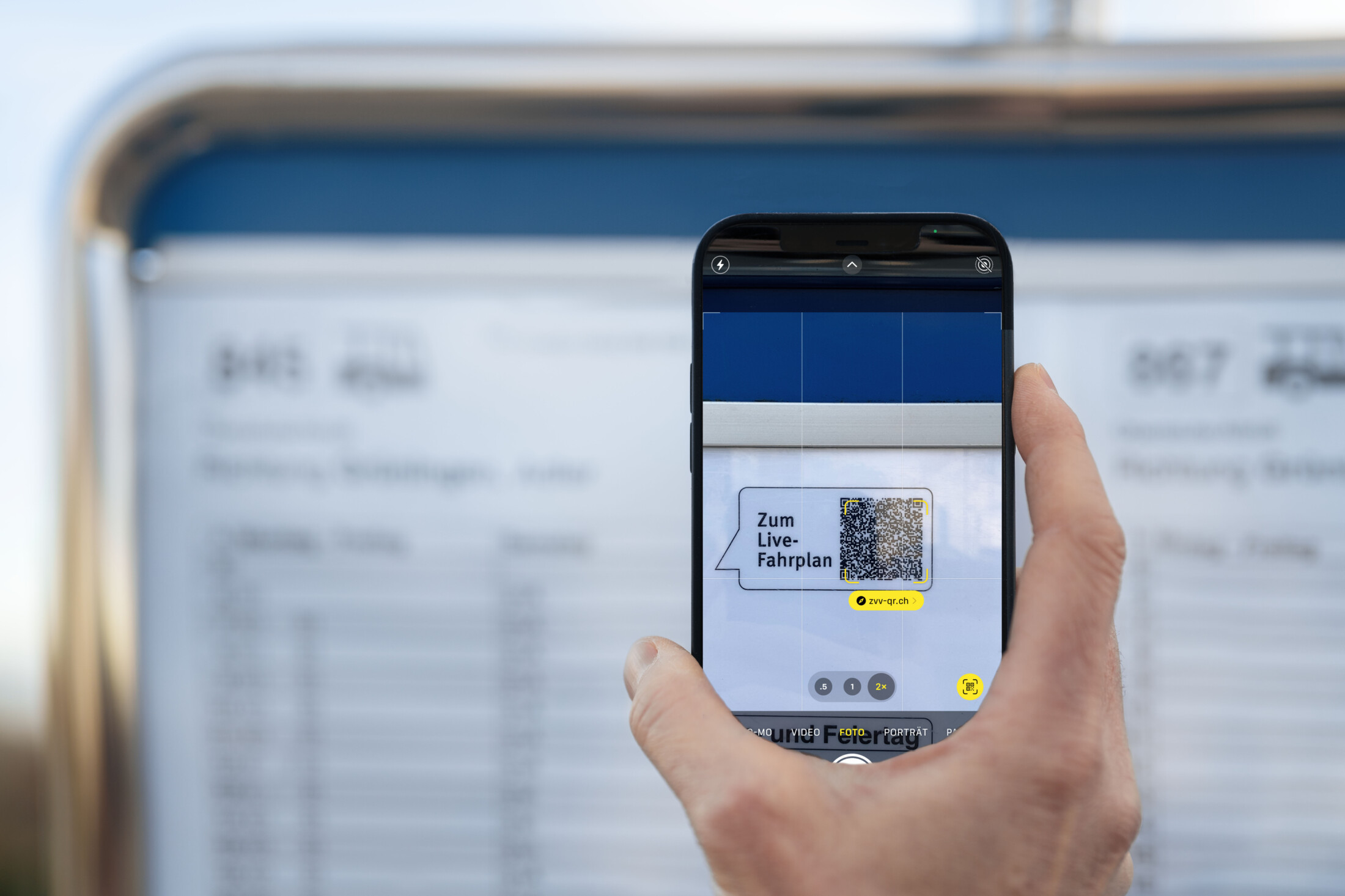 An jeder der 451 VZO-Bushaltestellen können Sie sich jetzt über die minutengenaue Ankunft Ihres Busses informieren. Per Smartphone wird ein sogenannter QR-Code fotografiert, welcher die nächste Busfahrt in Echtzeit auf dem Handy anzeigt.