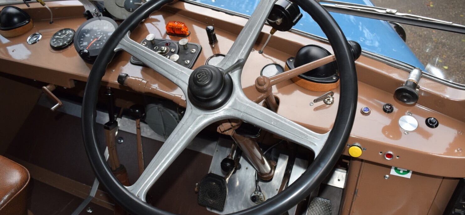 Eine Vierteldrehung am zierlichen Blechschlüssel, Billeter drückt auf den Startknopf. Sofort springt der wuchtige Dieselmotor unter der langen Haube an, die sich vor der Windschutzscheibe wie ein Schiffsbug aufbaut. Steuerrad und Cockpit zittern leicht bis er mit einem Hebelchen im Zentrum des Lenkrads das Standgas so eingestellt hat, dass der Motor fast vibrationsfrei schnurrt. Dafür genügen gemächliche 450 bis 500 Umdrehungen pro Minute. Bei maximal 1850 Touren bewegen 105 PS das 12,5 Tonnen schwere Fahrzeug bis zu seiner Höchstgeschwindigkeit von 75 km/h.